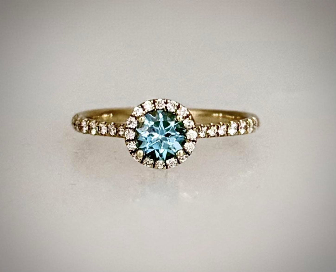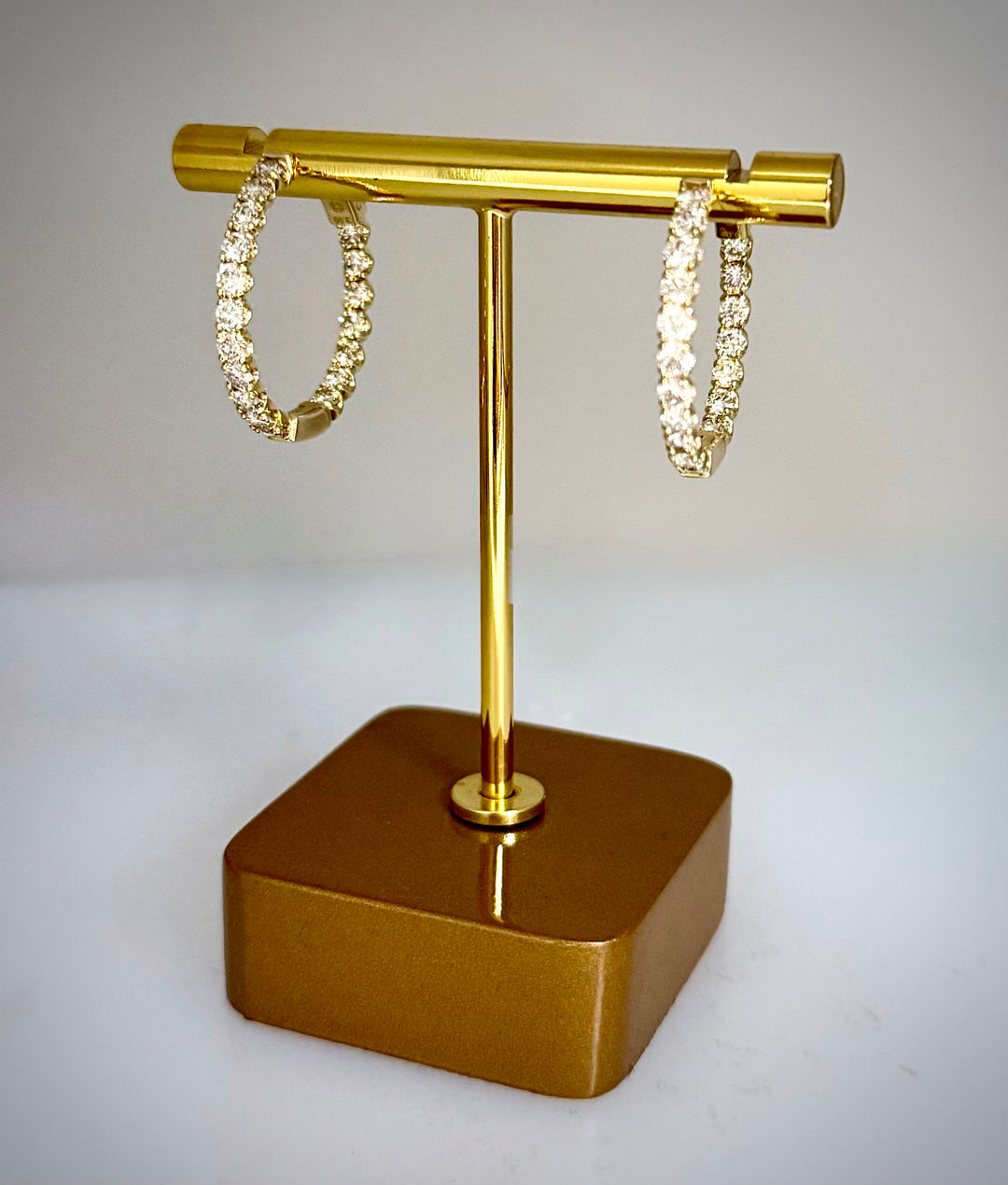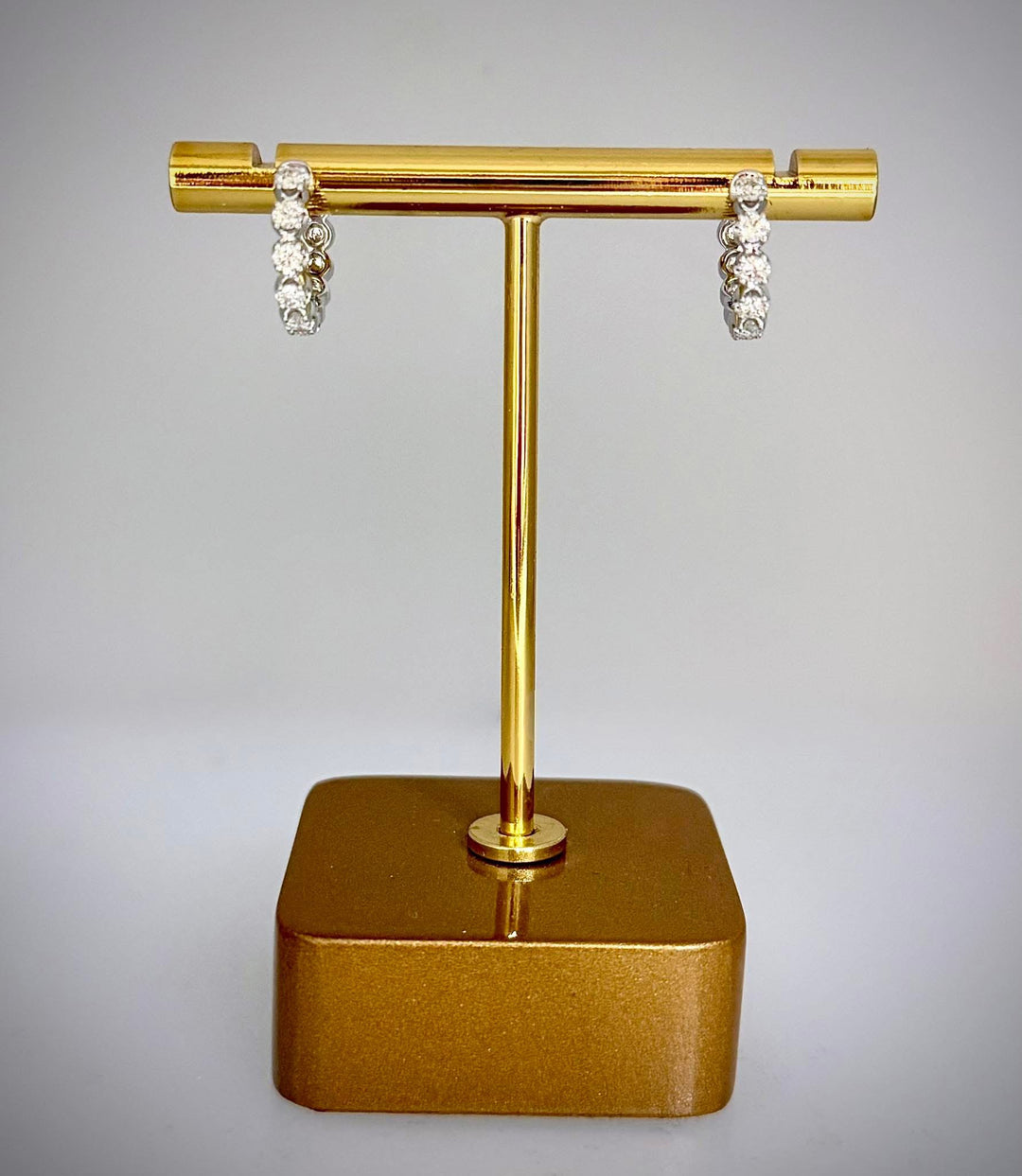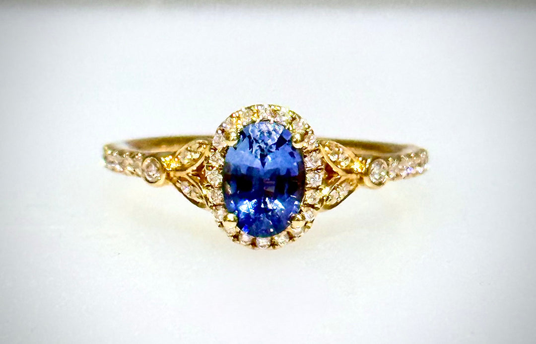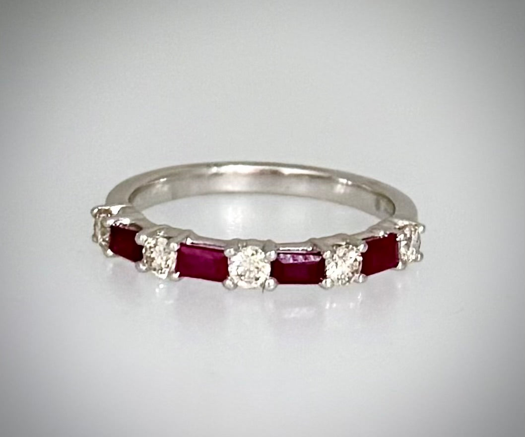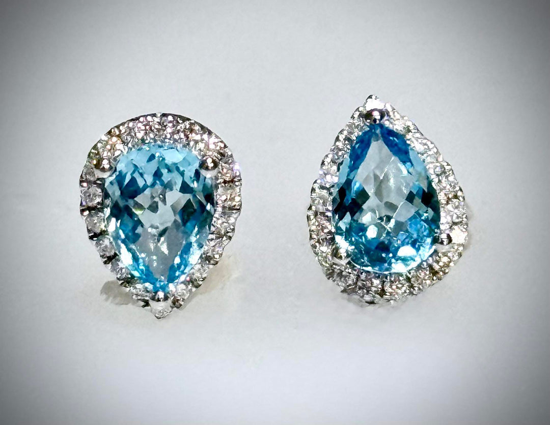 This pair of ruby earrings features an oval ruby center totaling .75 carats, surrounded by a diamond halo and secured with diamond posts set in 14 karat white gold.