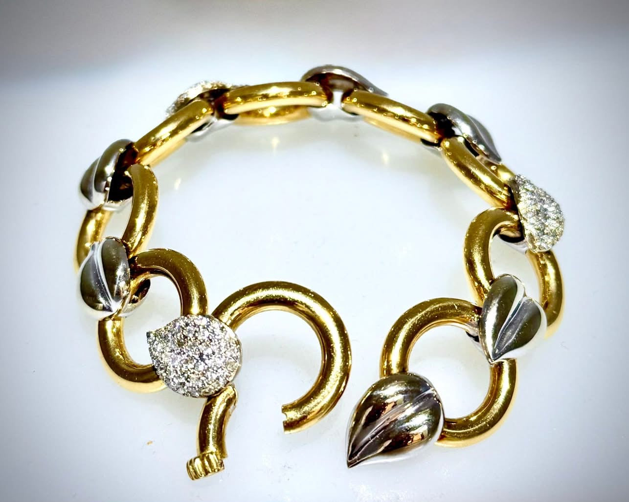 This 18-karat two-toned bracelet features a pattern of pave-set diamonds in a leaf design, with one diamond set amidst every two white leaves, boasting a total carat weight of 2 carats and weighing 66.86 grams.