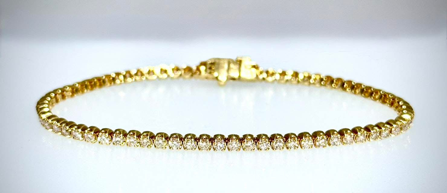 This elegant diamond tennis bracelet features 2.09 carats, a double safety catch, and is expertly set in 14 karat yellow gold.