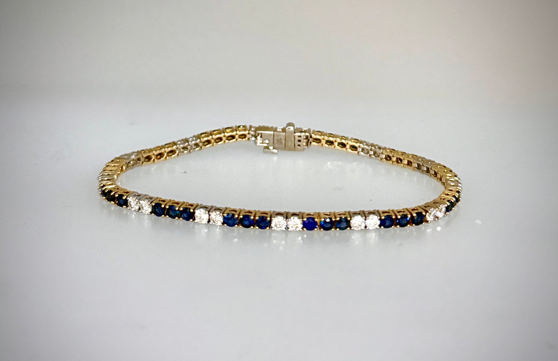 This tennis bracelet features an alternating pattern of 2 diamonds and 3 sapphires, boasting a total of 3.10 carats of sapphires and 1.91 carats of diamonds, set in 14-karat yellow gold.