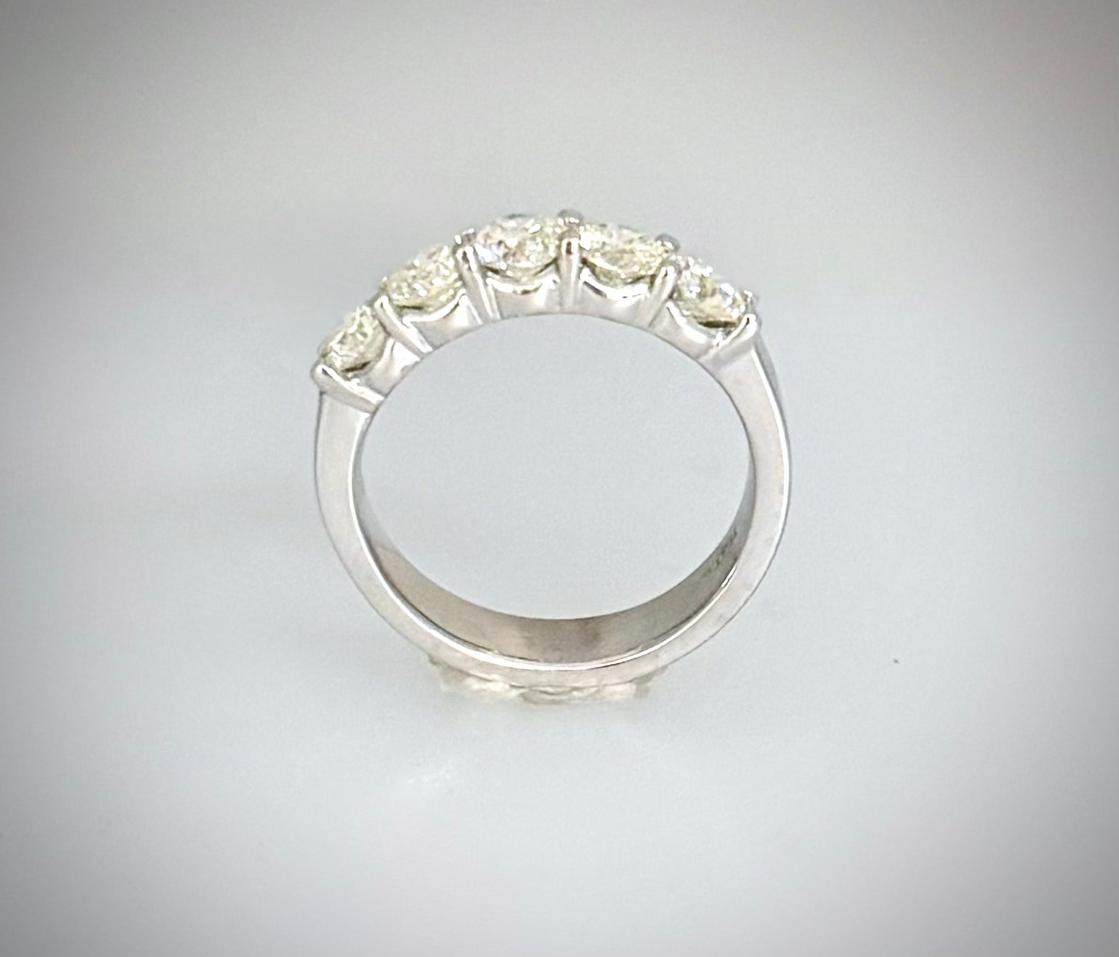 This platinum ring features 5 round diamonds totaling 1.57 carats.