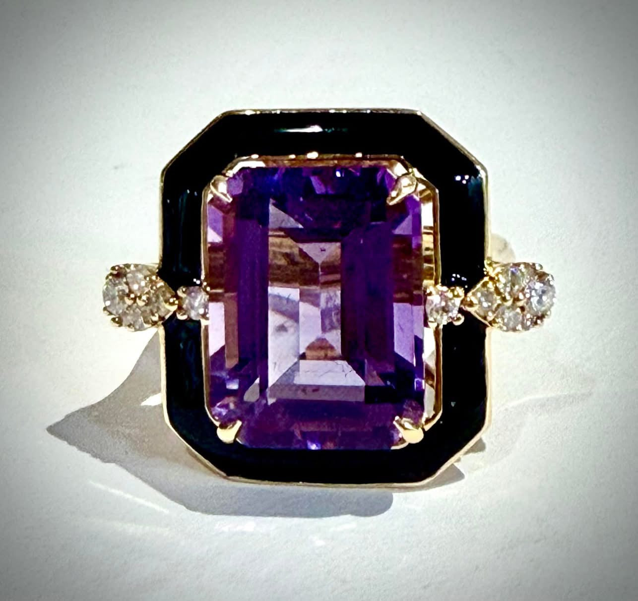 This beautiful emerald-cut amethyst ring features a border of black enamel and is accented on each side with 5 diamonds, forming a pear-shaped diamond accent.